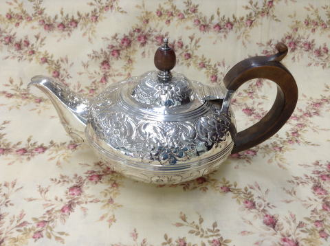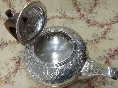 J純銀製ティーポット 1825年 ロンドン 税込 357,000円 工房名 Benjamin Preston 容量 600cc この時代では珍しい少人数用のティーポットです。デコラティブな装飾が全体に施されたとても贅沢なお品です。